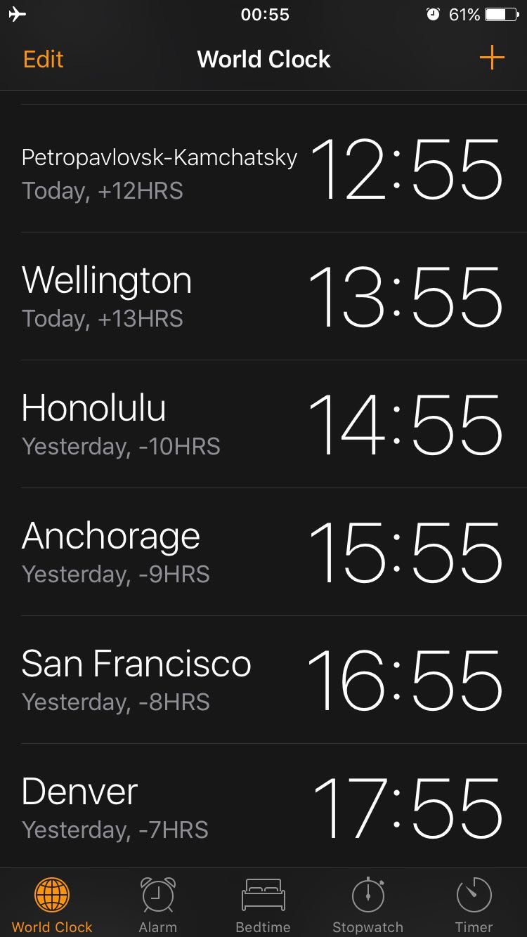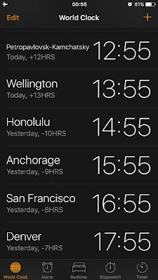 Our journey across all longitudes turned out to be a journey all over the world as sometimes there were no "nearby" cities to use and I referred to remote ones. This is how we ended up going to Petropavlosk Kamchatskiy in the between Australian and New Zealand time zones. We did not stay there for very long. Some time zones, like San Francisco (pacific US) and New York (eastern US) we spent less than 24 hours in. Some time zones we stayed for longer - going due south from Hobart to Mertz glacier we remained in one time zone for more than a week.