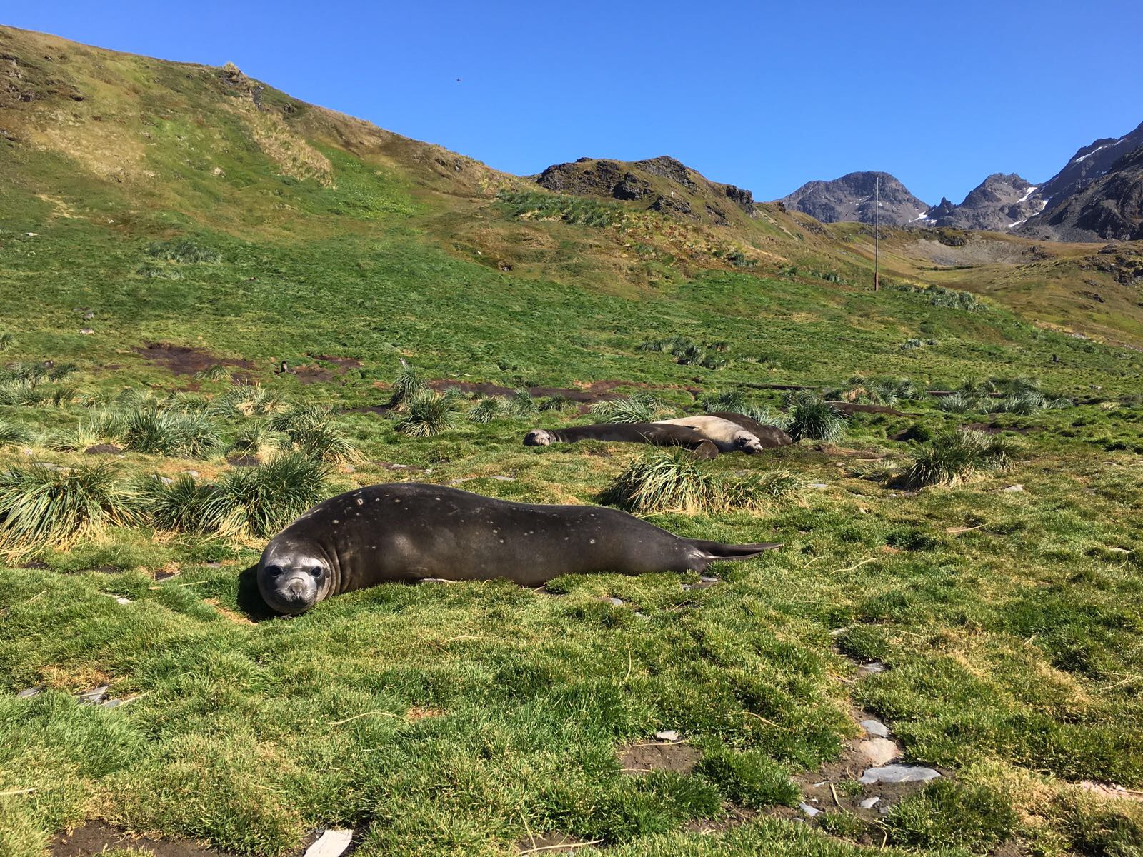 The storm was approaching, but still quite ways behind us and sheltered by a little bay we had the most perfect day one can imagine. It was warm, almost windless, sunny and gorgeous when we landed on South Georgia around lunchtime. We walked along the beach toward Shackelton grave. We were greeted by the locals: