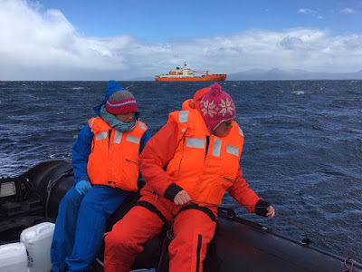 Today we were lucky enough to get off the icebreaker on a little adventure. Jenny and I and a bunch of biologist loaded two Zodiacs to collect water samples in the bay of the Kerguelen island, where the ship is currently anchored. Jenny was teaching me to use the microcat, so I can continue supporting this little adventure into the next couple of legs.